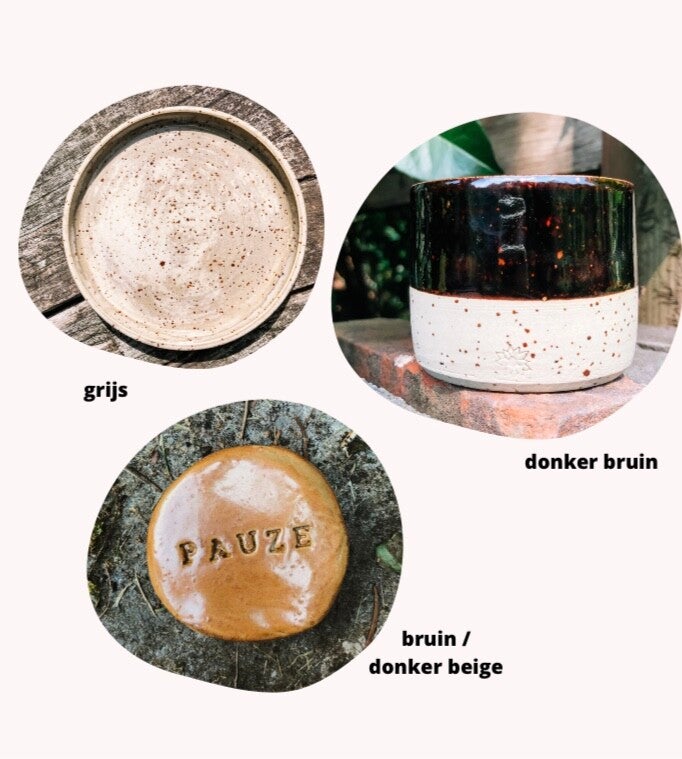 Zie foto's voor de mogelijke kleuren qua glazuur. Geef je keuze door in de opmerkingen bij de bestelling.