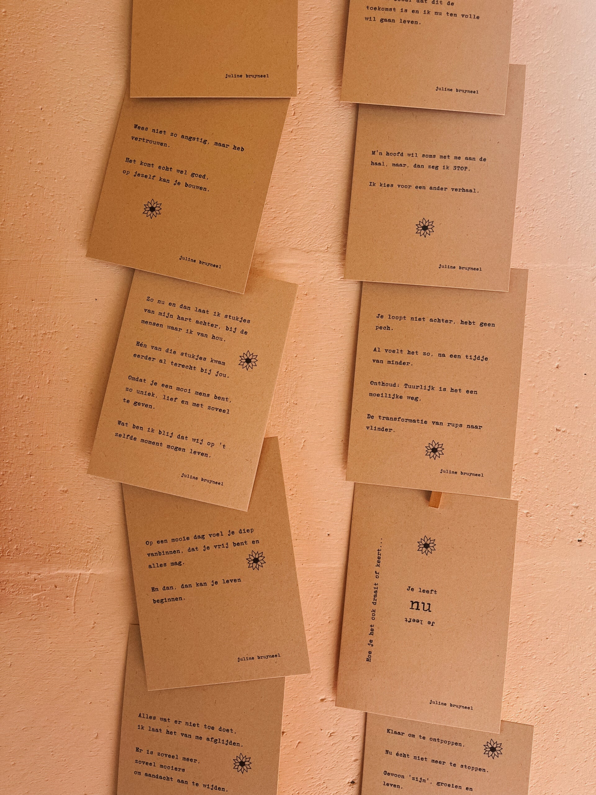 Een met tijd, liefde en aandacht samengestelde enveloppe met 3 schrijfselkaarten (postkaarten met eigen geschreven tekstjes), waarvan 1 schrijfsel in een speciaal jasje, enkele extra kleine gelukjes zoals thee, bloemzaadjes, ontspanningsoefeningen, een verhaaltje...